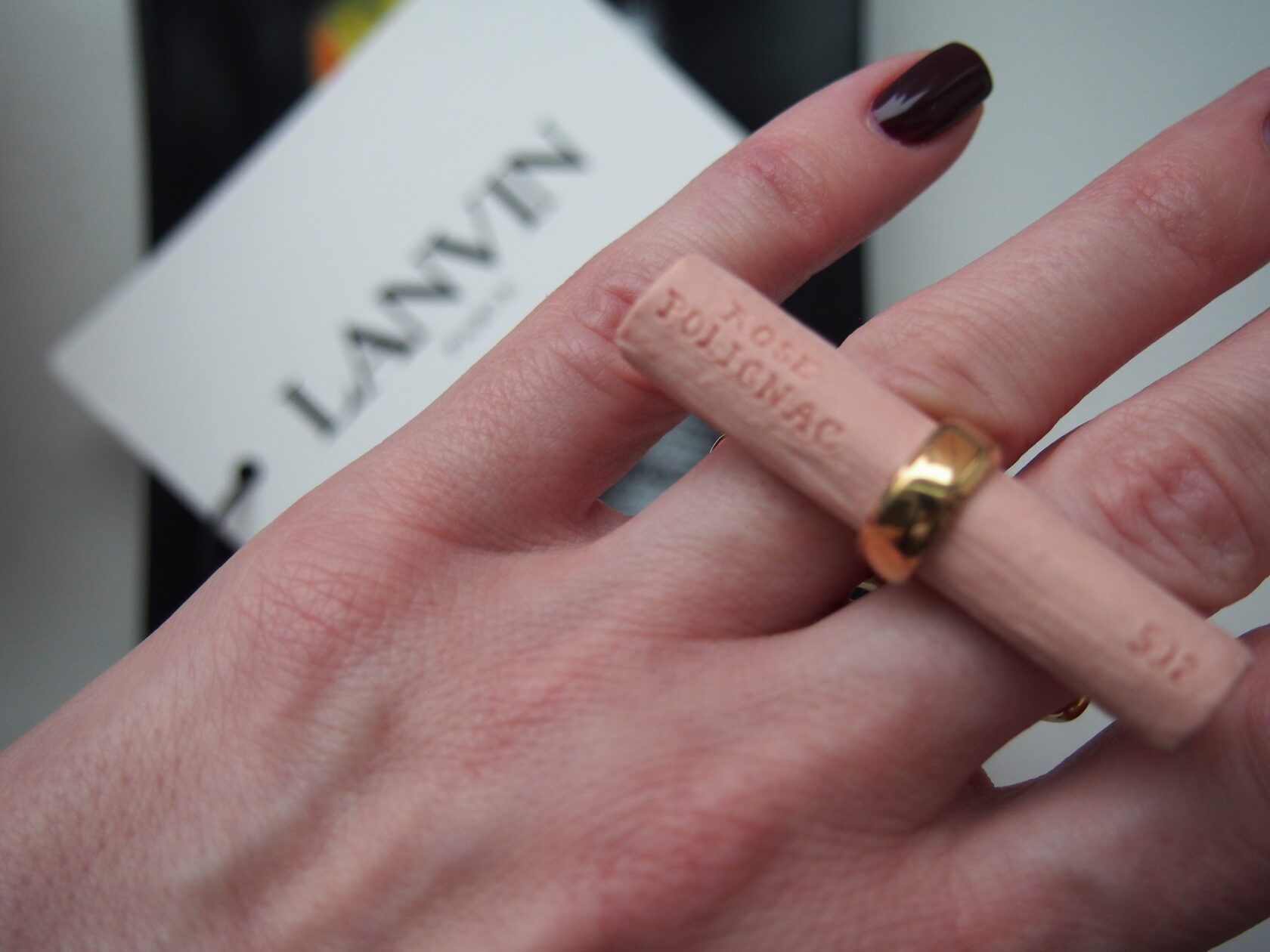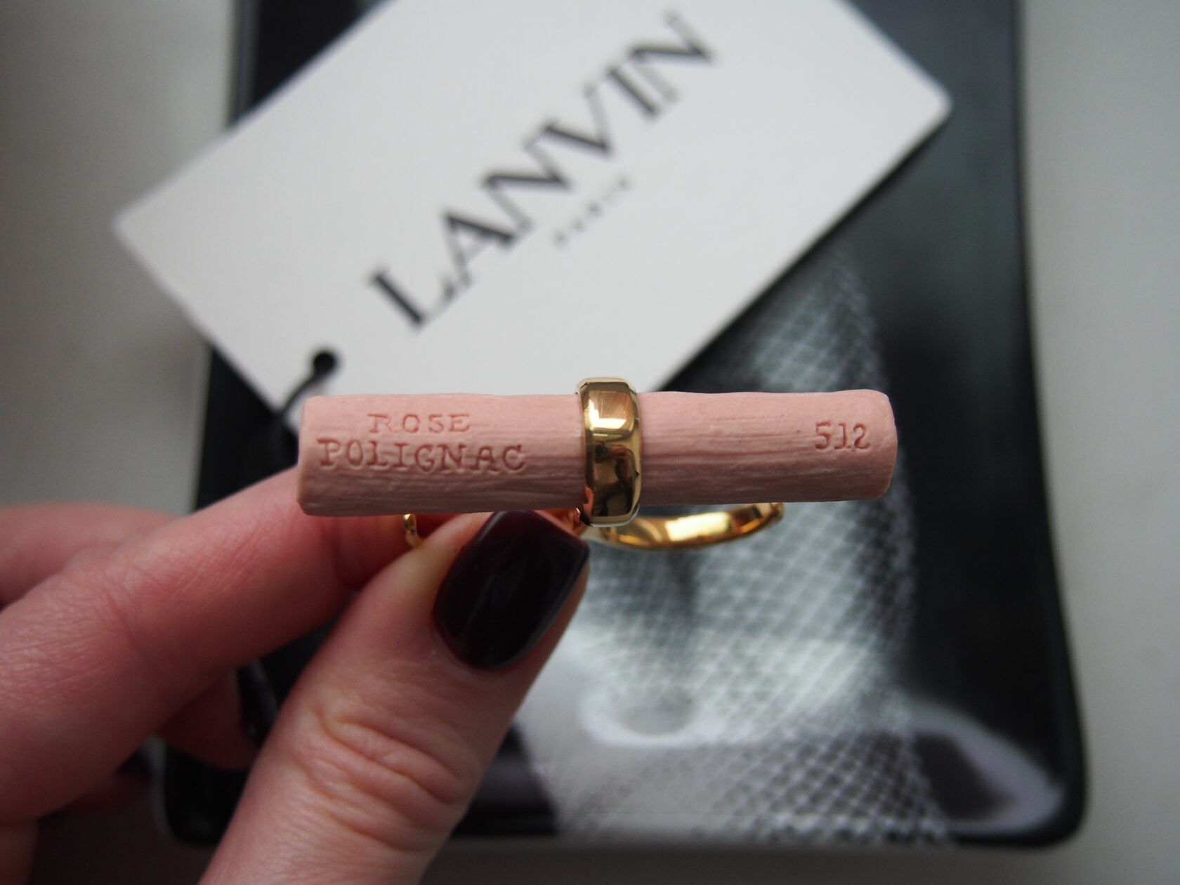 Кольцо Lanvin (период Альбера Эльбаза), имитация пастельного мелка для рисования. Лануть, керамика. Надевается на два пальца, размер регулируется. Цвет Rose Polignac считается изобретенным Жанной Ланвен и назван в честь ее дочери. Колье новое с оригинальной упаковкой